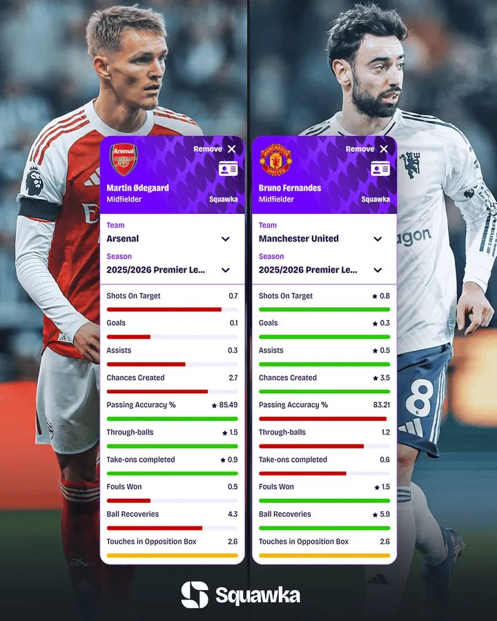 虎扑01月23日讯 本轮英超联赛,曼联将对阵阿森纳。赛前,Squawka对比了两队的中场大将——厄德高和B费在本赛季英超联赛的场均关键数据。
